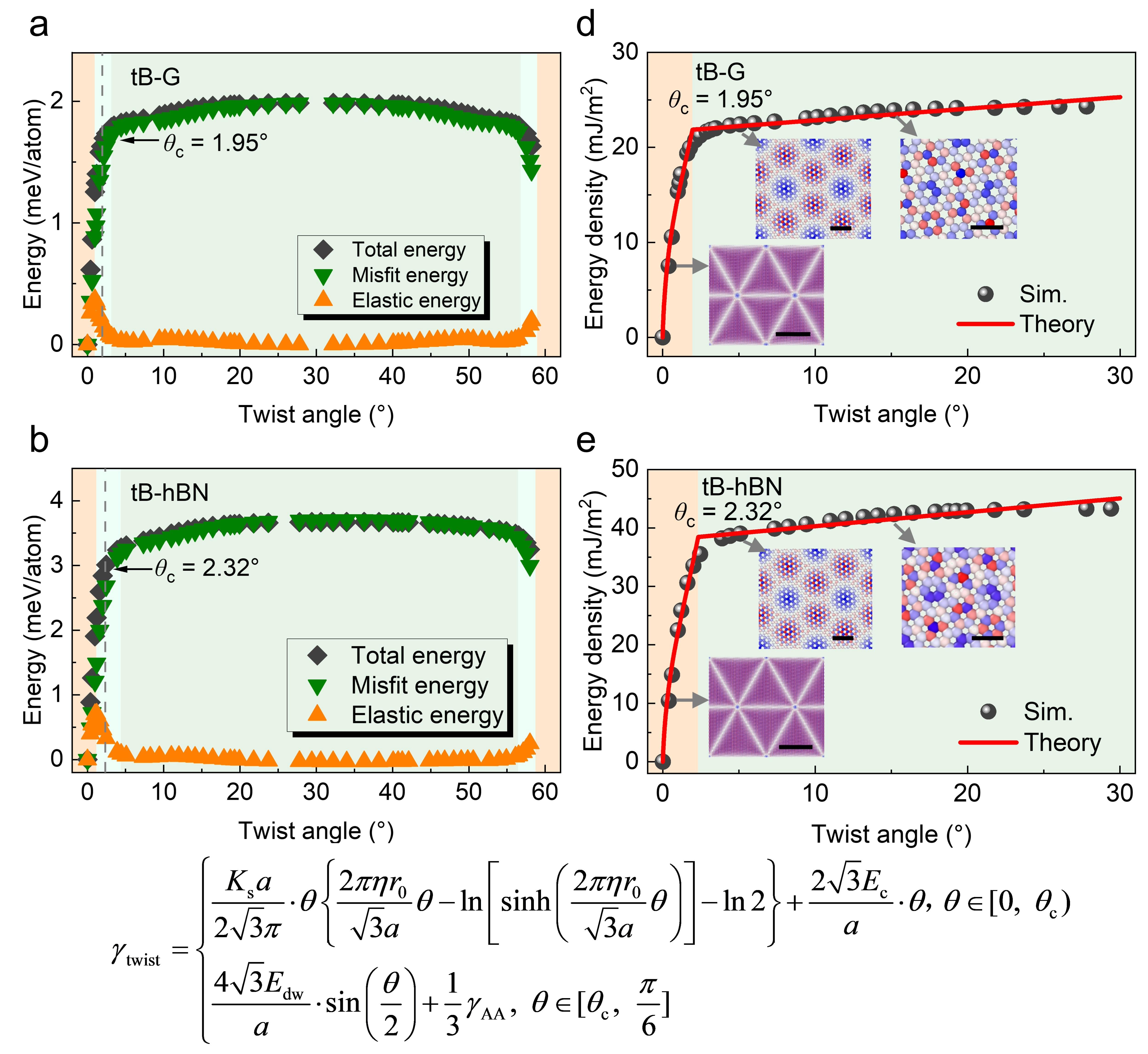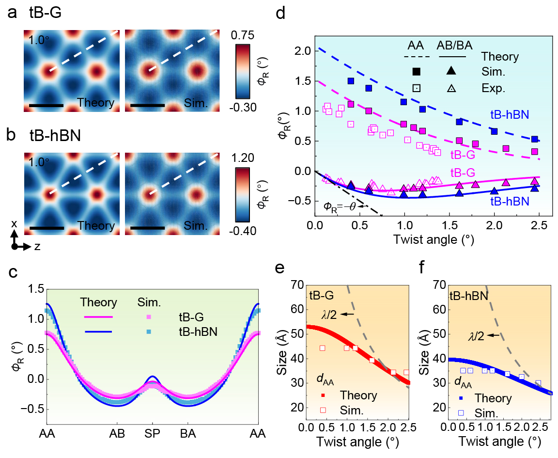 以及力学与工程交叉研究院李晓雁教授课题组基于各向异性位错理论,建立了一套全解析的理论模型,清晰地揭示了“扭转角度—结构变形—能量特征”三者间的精确定量关系。在小扭转角度下,扭转二维材料的莫尔云纹主要表现为由分位错构成的三角形网络结构。该模型给出了扭转二维材料的局域旋转场、应变场及应力场的完整解析表达式(图2-4),并阐明了能量密度随扭转角度变化的非线性规律(图5)。当扭转角度较大时,莫尔云纹则呈现以AA堆垛为核心的六边形畴结构及伴随的畴壁网络。针对这一结构特征,该模型同样建立了能量密度与扭转角度之间的解析关系。在0°到30°的扭转角度范围内,随着角度增大,扭转二维材料的能量密度呈现先快速升高、后逐渐趋于饱和的变化趋势(图5)。为进一步验证和完善理论模型,针对扭转双层石墨烯(tB-G)、扭转六方氮化硼(tB-hBN)及扭转三层石墨烯(tT-G)体系开展了大规模原子模拟,并将理论预测与模拟结果和已有研究进行了对比。模型所预测的局域旋转场、应变场、应力场以及能量密度随扭转角的变化规律,均与原子模拟结果以及已有实验和模拟数据高度吻合(如图2、图3、图5),表明该理论模型能够准确描述扭转二维材料的结构变形与能量演化特征。该研究不仅深化了对二维材料莫尔超晶格物理机制的认知,也为系统表征该类材料的变形与能量特征提供了一套完整的解析理论框架,为主动设计和精准调控扭转二维材料的物理特性提供了重要的理论基石。
